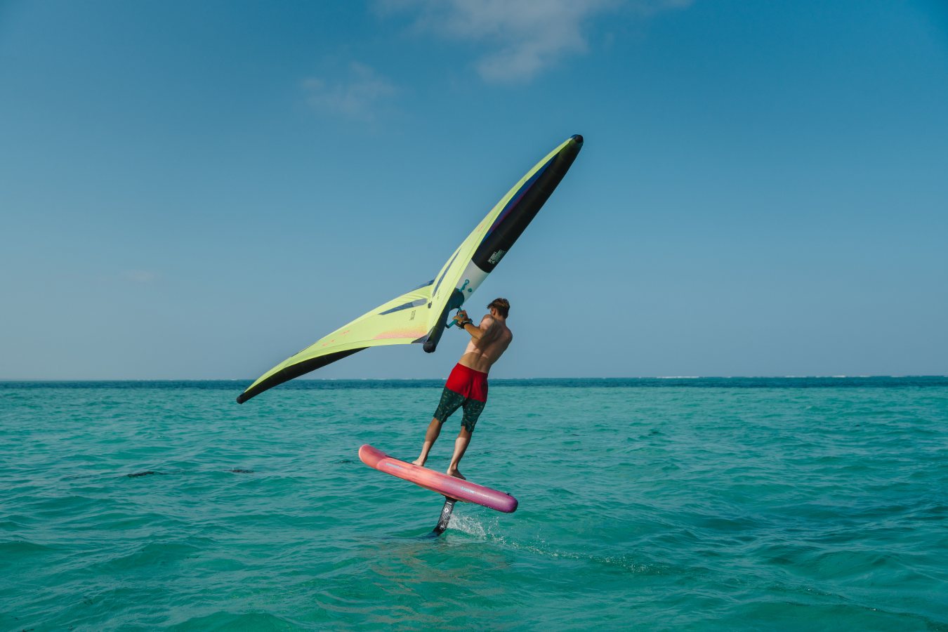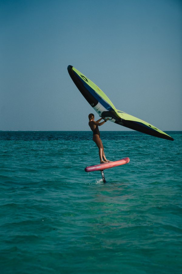 Wing foil rentals are available exclusively to independent riders or students who have completed lessons at the center.